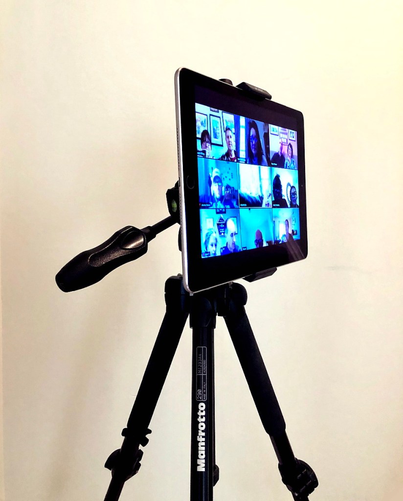 At first we used our iPad propped up on a few books on a table as our only device to log in and connect with friends. That worked fine until I knocked it over a few times reaching for my coffee. So that has lead us to a continual improvement mode and our own list of Zoom Hacks.