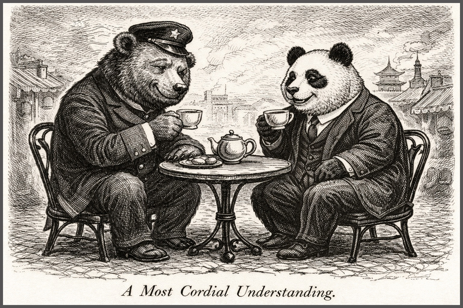 A Most Cordial Understanding is my first shot at a cartoon in the early style of 1840s Punch Magazine. It is very much in the Punch sweet spot: Polite on its face, slightly smug in tone, faintly ominous once you sit with it. We get a sense of two “respectable” powers conducting business as usual over tea; when paired with the recent pronouncements regarding Greenland, one can only wonder what they are really thinking.