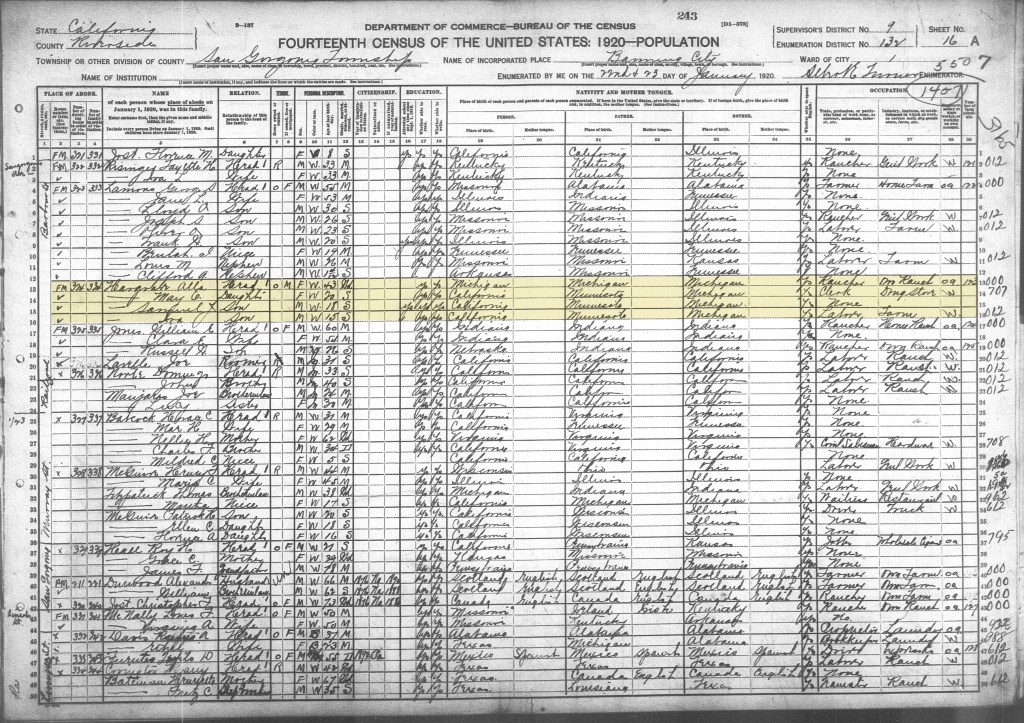 Ira Hargrave was a fruit farmer in San Gorgonio Township, Riverside County, California according to the 1900 Census record. He died Christmas Eve in 1903. The 1910 US Census lists my grandmother then ten years old and her brothers Jay and Ira, eight and six years old. Her mother Betsy Alavander “Alla” Blackburn is listed as head of household in 1910, a fruit farmer. Later years her occupation would be rancher. Youngest brother Ira was born January 13, 1904, three weeks after his father had died (24 Dec, 1903).