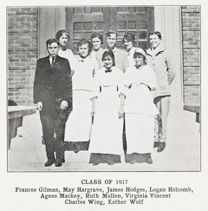 1917 was a small graduating class in Banning Union High School. In the photo above, Emma May stands in the backrow, one of six women in a class of nine. (photos from Calisphere). Three years later, in 1920, Emma was working as a clerk in a drugstore. My grandfather Ralph Allan Hilbig is listed in the 1923 Redlands City Directory; Ralph was working at DH Frazer Pharmacy at that time, some 20 miles northeast of Banning. This might have been where he met Emma after his first wife passed away in 1922.