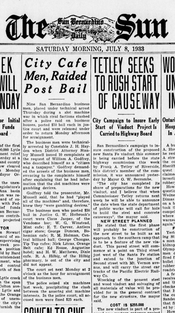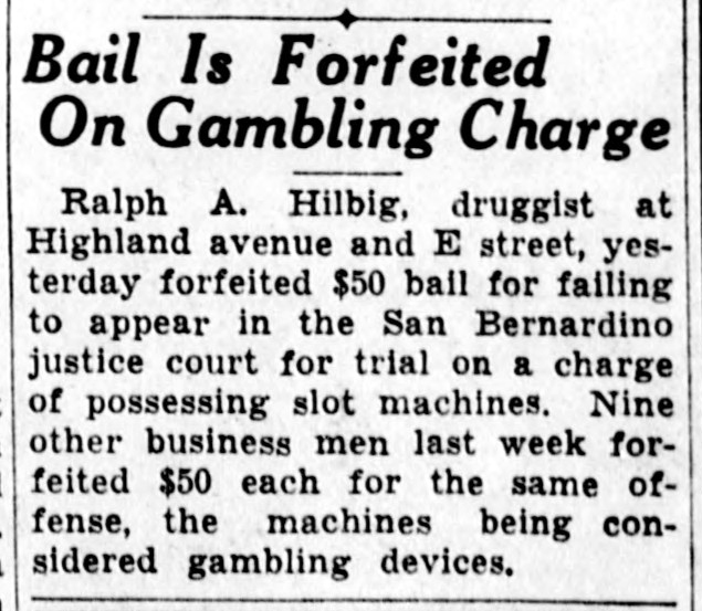 On the 8th of July nine San Bernardino business men were placed under technical arrest during a slot machine war. The District Attorney had issued 10 complaints at the request of a private citizen who attested that the machines were gambling devices as he had played all of them. Arrested were a bar owner, cigar store owner, several cafe owners and a billiard hall owner. My grandfather Ralph A. Hilbig, who was out of the city at the time (the Chicago trip) could not be brought in. All the men were fined $25. While the police had raided 11 establishments, they only seized 9 slot machines, two of which were at my grandfather’s pharmacy. I can only imagine now why he would “assertedly” have gambling devices in his drug store (what could they possibly pay off in 1933?!). But later news articles never indicate the eventual disposition of the seized machines.