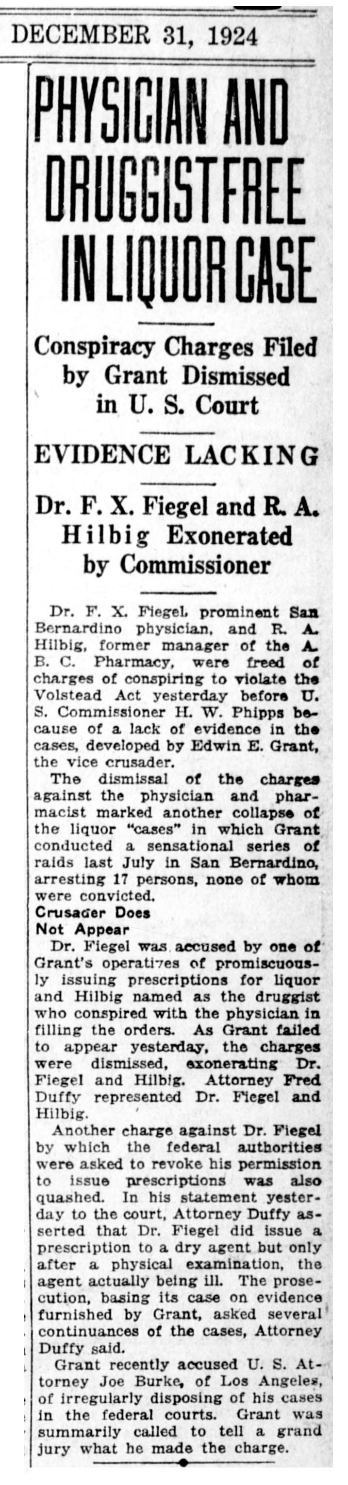 At the end of December the San Bernardino Sun reported that the case had been dropped due to lack of evidence. In their reporting, The Sun wrote at the time: “The dismissal of the charges against the physician and pharmacist marked another collapse of the liquor ‘cases’ in which Grant conducted a sensational series of raids last July in San Bernardino, arresting 17 persons, none of whom were convicted.”