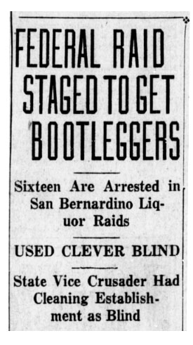 In the July 13th article, 25 officers struck simultaneously across the city of San Bernardino after a two month investigation, arresting sixteen accused bootleggers and an additional six from two nearby localities. S. Sakamoto, owner of the A.B.C. Pharmacy, along with my grandfather who worked as a druggist at that location, were charged with conspiracy to violate the Volstead Act–a felony offense which would result in imprisonment in a federal penitentiary if convicted. The complaint charged that the physician (Dr. FR.X. Fiegel) furnished a prescription for whiskey which the druggist (R.A. Hilbig) filled. Along with the others arrested, a 400 gallon still and 1600 gallons of mash were also seized in the raids at a nearby town. The raids were directed by Edwin E. Grant, president of the State Law Enforcement League at the request of an anonymous committee of concerned citizens.