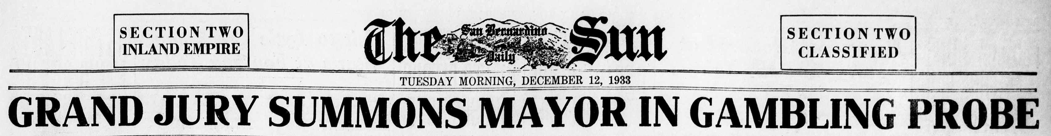 The headline couldn’t get any more graphic: “Grand Jury Summons Mayor in Gambling Probe.” The date of the newspaper, December 12, 1933. That attention-grabbing headline overshadowed three other articles on the same page. The editorial, “City’s Intolerable Gambling and Vice Must be Stopped,” gave some indication of what was going on in the city of San Bernardino that year. A smaller headline read “Seek Teeth in Gambling Law”. But the one that caught my attention simply stated “Raid Suspects Before Court”. And there in the second paragraph, in the last sentence, was my grandfather’s name. Ralph Hilbig, Highland Avenue and E Street.