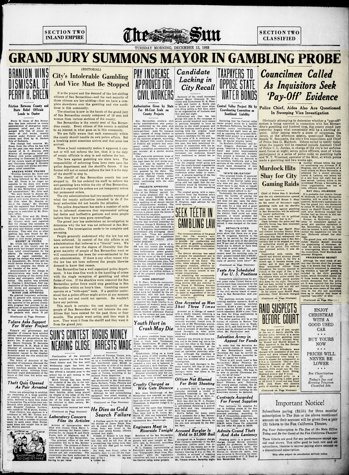 By December of 1933 a grand jury was conducting an inquiry into city vice and gambling during which Mayor Seccombe, Murdock, Jordan and others were called to testify.