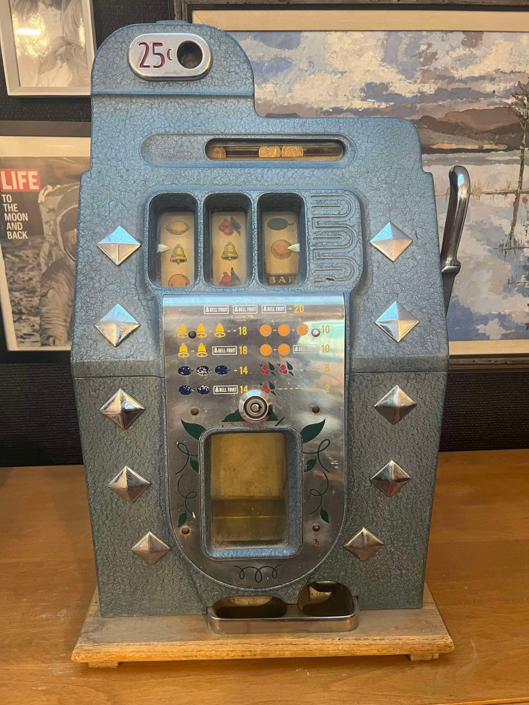 California the “Golden State” is the US’s largest Indian gaming state, with yearly casino earnings of around $9 billion. California has 76 Indian casinos and five mini-casinos, owned mainly by its 109 tribes. (playtoday.com) Today nearly everyone is familiar with slot machines, the original “One-Armed Bandit” and they can be found in many states which now have legalized gambling of one type or another. Below is a machine from the collection of a family member, an early 1940’s Mills Diamond Front Slot Machine, originally produced in 1933 by the Mills Novelty Company of Chicago. Mills was one of the few companies which manufactured both gambling and vending machines.