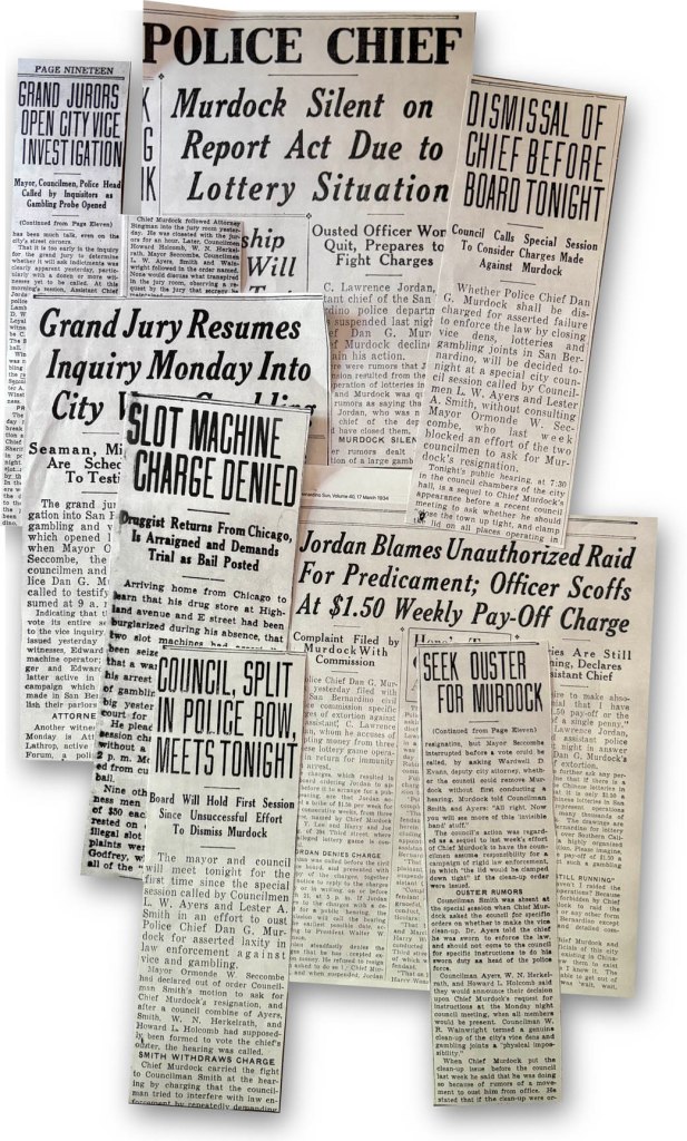 Upon election, the new mayor chose for his chief of police Dan Murdock, a deputy sheriff in the county. Speculation at the time had him choosing another individual and the choice eventually came down to Murdock or another San Bernardino policeman, C. Lawrence Jordan. With Murdock as Chief, Jordan was named the night Chief of Police.