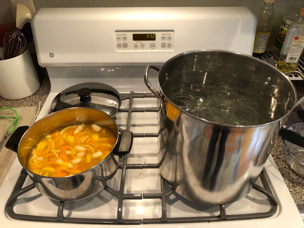 There are a lot of recipes available online, I’m surprised anyone buys cookbooks these days, and it was easy to find a recipe that suited my low-fuss cooking style. There aren’t a lot of ingredients involved as one can imagine (fruit, water, added sugar and possibly pectin); however I threw in a cinnamon stick to give it a little extra kick, and three lemons (juice and peels) to help recover some of the acidity that the mandarin oranges were missing.