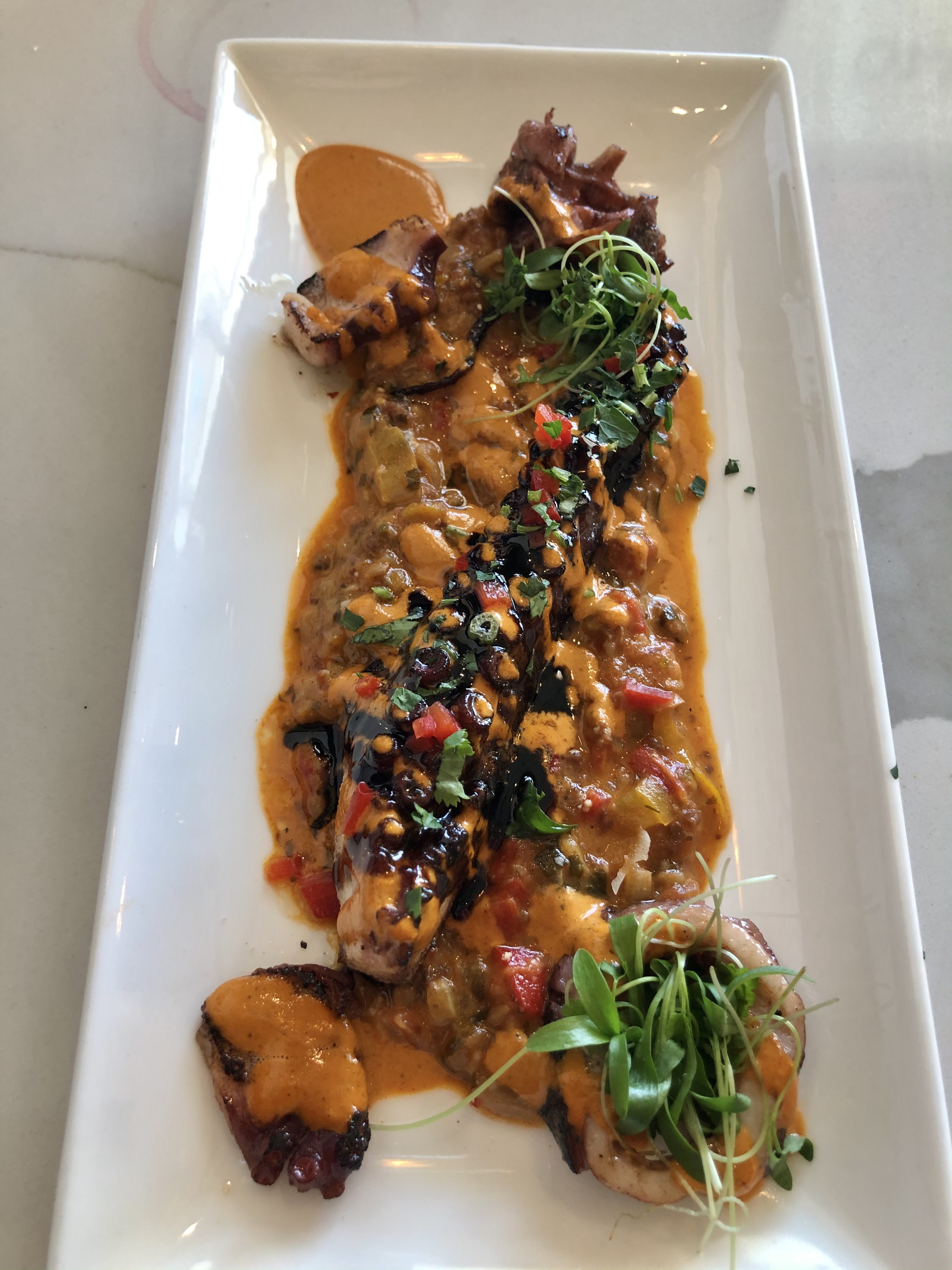La Prensa Tacos and Tapas opened last December in Sterling and has been growing in popularity since. Deb and I stopped in after church one Sunday hoping to avoid the afternoon and evening crowd I had seen on a recent drive by pick up at Nothing Bundt Cakes next door. What a treat! We tried several of the tapas and a birria quesadilla, all delicious. They offer two types of sangria so we ordered a glass of each to go with our tasting meal. The grilled octopus with Salsa Basquaise was amazing and had me thinking about our visit to Barcelona. The menu is Mexican influenced according to chef Santosh Tiptur, owner of The Conche in Leesburg, with half of the menu featuring tacos, enchiladas and quesadillas, the other half featuring small-plated tapas. There are three items on the dessert menu (save room!) and the churros drizzled in chocolate served with ice cream was my favorite. The flan was nice, but really no competition with the churros. I’m giving them two thumbs up. Try them soon for an upbeat modern version of a Spanish tapas bar.