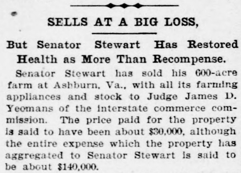 In looking back over his long and varied career, Senator Stewart writes in his 1908 memoirs, “The Reminiscences of Senator William M. Stewart of Nevada,” of the many legal cases he took part in, fights won, laws passed. Nowhere does he mention his Ashburn dairy farm or the time spent in the Virginia countryside recovering his health.