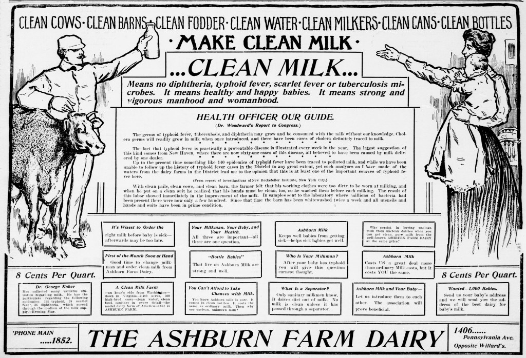2,000 Acre Milk Farm in Virginia“Clean milk from clean cows, fed on clean food, drinking clean water, milked by clean men in clean barns, sent to Washington in clean cans and delivered to families in sealed bottles.”