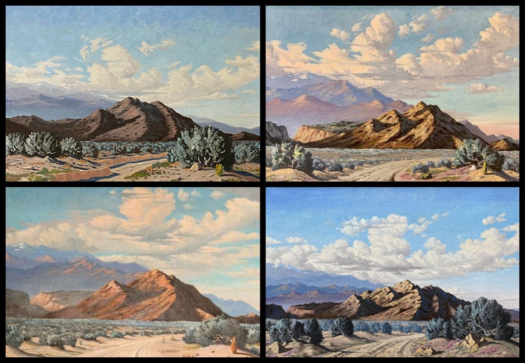 All five images bear striking similarities: the pyramid-shaped mountain in the middle ground, mountains to the left of the image, sagebrush in the lower right foreground. All of them are overshadowed by immense cumulonimbus clouds. Of the four, I prefer the overall coloring in ours: the coral-tinged mountains are a little closer to the viewer; the arroyo or dirt road in the center has a slate grey that mimics the snow covered mountains in the distance. Orange flowers dot the foreground and place the image as perhaps early spring, snow hasn’t yet receded from the mountain peaks.