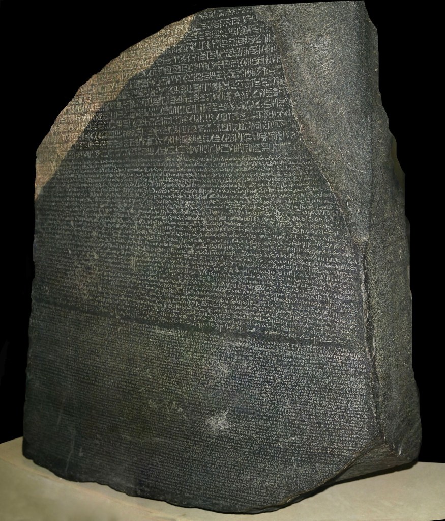 While the top and middle groupings of text are Egyptian using hieroglyphic and Demotic scripts respectively, the bottom is in Ancient Greek. It was discovered in 1799 by the French during the Napoleonic Campaign in Egypt and became the key to deciphering Egyptian hieroglyphs.
